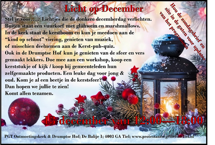 ![]() Het duurt nog even voor het zo ver is, maar de organisatie is begonnen, dus... Op zaterdag 13 december 2025 van 12:00-18:00 uur organiseren we in de Ontmoetingskerk en Drumptsehof, alweer de 3e editie van "Licht op December". Een gezellig evenement met workshops, muziek, catering en kraampjes. Voor deze dag zijn we op zoek naar mensen die het leuk vinden om eigen creaties te verkopen/tonen of een leuke workshop te geven. Ook als je het leuk vindt om muziek of ander talent met ons te delen, ben je welkom dit deze dag in de Ontmoetingskerk ten gehore / tonele te brengen. | ||