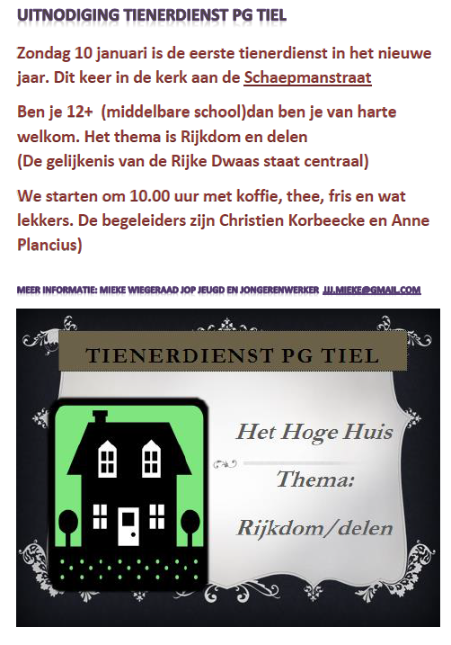 zondag 10 januari 2016 om 10:00 uurTienerdienst Schaepmanstraat